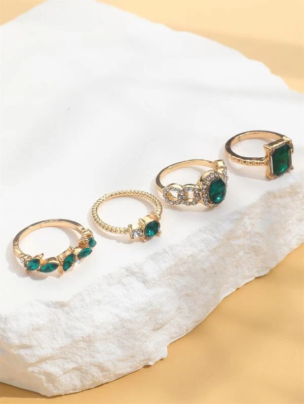 4 PEÇAS ANEL DECORAÇÃO DE STRASS E PEDRA VERDE